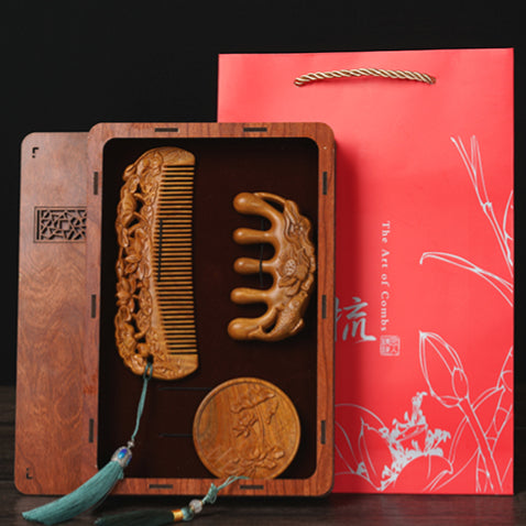 Custom Engraved Sandalwood Comb Set - Floral Green Acupressure Comb & Mirror Gift Box with Free Engraving