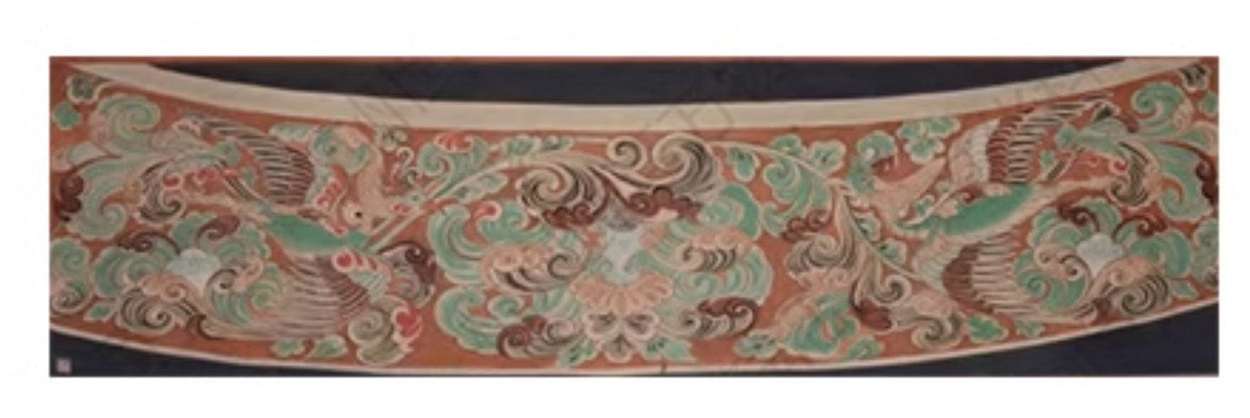 La fresque représente deux phénix encadrant un motif central de rinceaux, rendu par des pigments minéraux éclatants. Leur plumage, parfaitement articulé, illustre les codes de l'iconographie aviaire de la dynastie Tang, tandis que les motifs botaniques entrelacés symbolisent une vitalité perpétuelle.