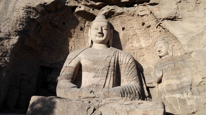 Ce côté présente l'emblématique Bouddha assis de la grotte 20 des grottes de Yungang (Datong, Chine), chef-d'œuvre de la sculpture bouddhique de la dynastie des Wei du Nord (460-494 apr. J.-C.). Sculpté directement dans des falaises de grès, ce Bouddha de 13,7 mètres de haut incarne l' influence artistique du Gandhara (mélange de styles indien et hellénistique) et la sensibilité esthétique chinoise. Les traits allongés de la statue, ses robes monastiques drapées et sa posture méditative symbolisent la sagesse, la tranquillité et la propagation du bouddhisme le long de la Route de la Soie. Figurant parmi les premiers Bouddhas de pierre de grande taille de Chine, il représente l'apogée de l'art bouddhique chinois primitif.