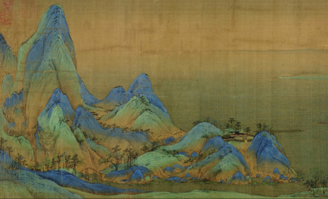 TheA Thousand Li of Rivers and Mountainsscroll, a masterpiece by the Northern Song Dynasty painter Wang Ximeng, captures an awe-inspiring panorama of endless mountain ranges, expansive rivers, and meticulously rendered landscapes. Fishing villages, waterside pavilions, and arched bridges nestle harmoniously among peaks and lakes, creating a world where grandeur and intricacy coexist. From afar, the scroll exudes majestic vastness; up close, its delicate brushwork reveals shifting vistas that astonish with every gaze. As the Yuan Dynasty scholar Pu Guang praised in his colophon:“Among all miniature landscape paintings past and present, this work stands unparalleled for a thousand years—like a solitary moon outshining a sea of stars.”