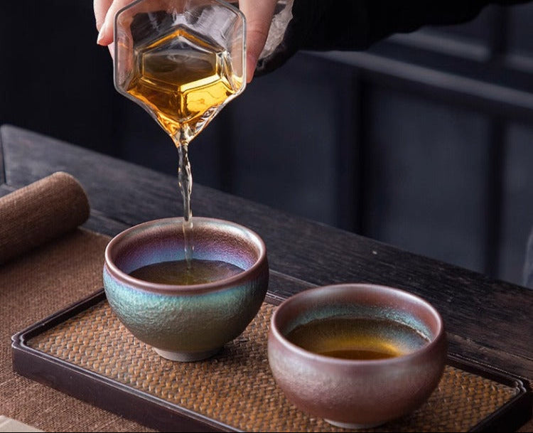 Naturally formed through high-temperature firing, the crystalline hues create a spectrum of endlessly shifting colors—a visual feast of unparalleled beauty. Cradling the teacup, you’ll feel its smooth, polished texture and sense the artisan’s devotion within, as light dances across its radiant surface, releasing a subtle fragrance.