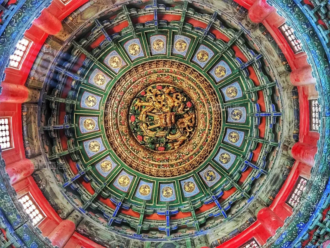 Adorned with phoenix motifs along the borders, resplendent in gold and vibrant hues, the caisson ceiling features auspicious cloud patterns, intertwining peony vines, and geometric designs. Carved vermilion lattice windows evoke the vast celestial vault, while coiled dragons clutch pearls overhead. Majestic and dignified, this architectural marvel blends robust elegance with sacred grandeur. Gaze upward to behold this splendor—a caisson ceiling that transforms the ordinary into the divine.